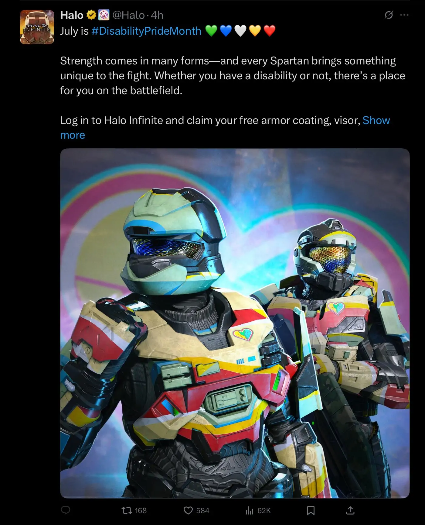 もう一度、halo Infiniteは精査の下で自分自身を見つけます – 今回はゲームプレイの問題やコンテンツの遅延ではなく、企業の美徳シグナル伝達の別の例として認識されるものです。時計が7月1日に真夜中を鳴らし、プライド月の終わりをマークしたとき、Xプラットフォームの公式haloアカウントは、障害のプライド月間を祝うための新しいゲーム内プロモーションを発表しました。